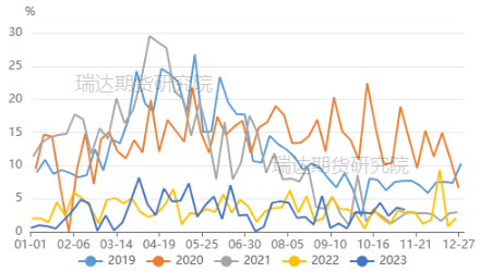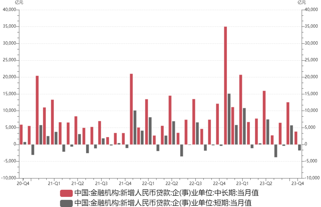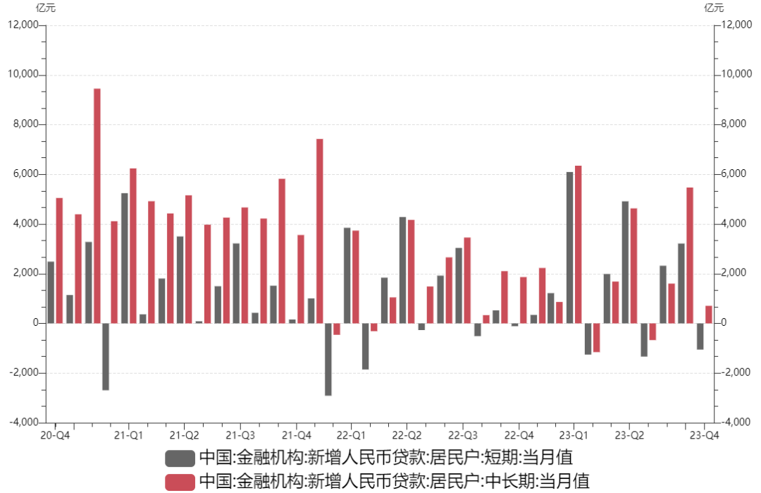 本月信贷总量上季节性下行,结构上居民融资端也再度回落,仍有恢复空间。在房地产政策底初现后,居民端缓慢修复。四季度企业信心普遍偏弱、尚在复苏,企业端中长期贷款小幅回落。其中,短期贷款减少1770亿元;中长期贷款增加3828亿元,季节性影响显著。