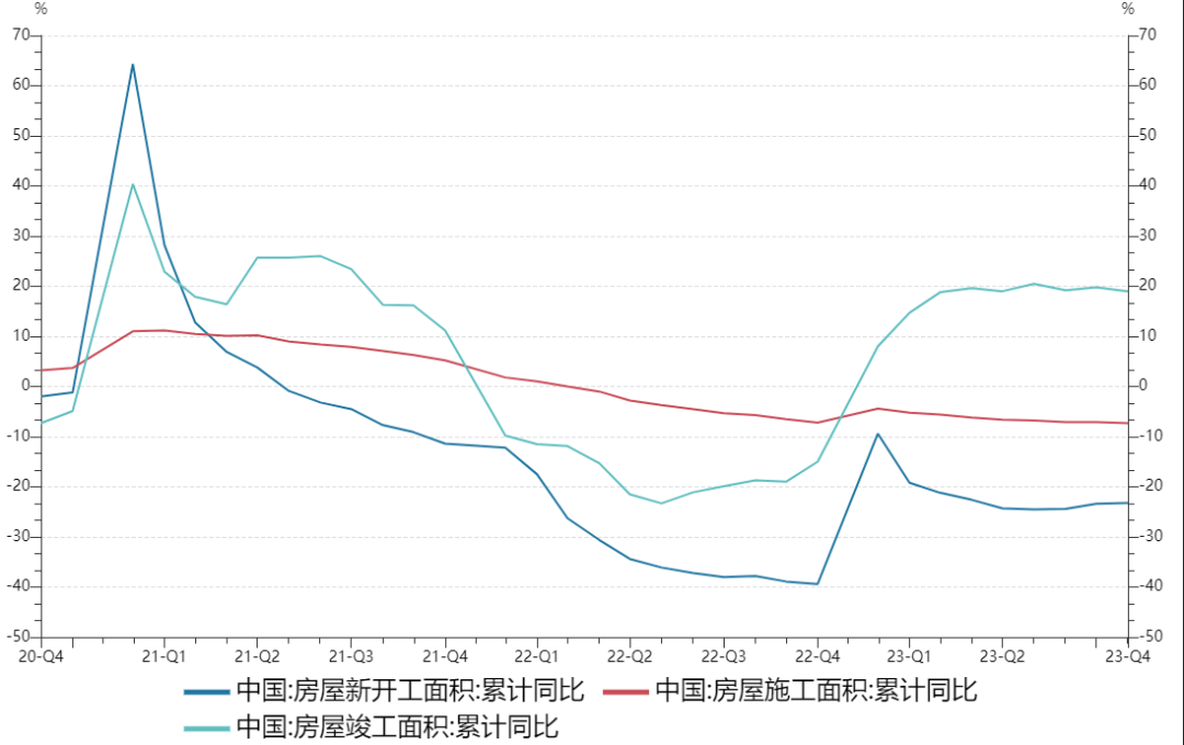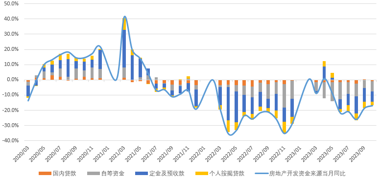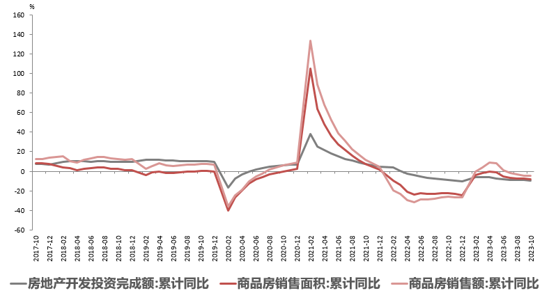 房地产开发投资同比降幅从上月的9.1%进一步扩大至9.3%,销售额、销售面积同比降幅继续扩大,新开工、施工面积累计同比仍处于历史低位运行,居民购房需求显不足、地产需求仍待企稳。同时从需求端来看,房地产销售市场小幅改善,10月前30日,30大中城市商品房成交套数和面积同比分别为-6.4%和-6.3%,分别较上月降幅收窄15.9和16.0个百分点,低基数下降幅收窄,但居民购房需求未有明显改善,促进房地产复苏的效果仍未完全显现,居民信贷端的改善仍需一定时间才能传导至投资端,景气度有待进一步加强。