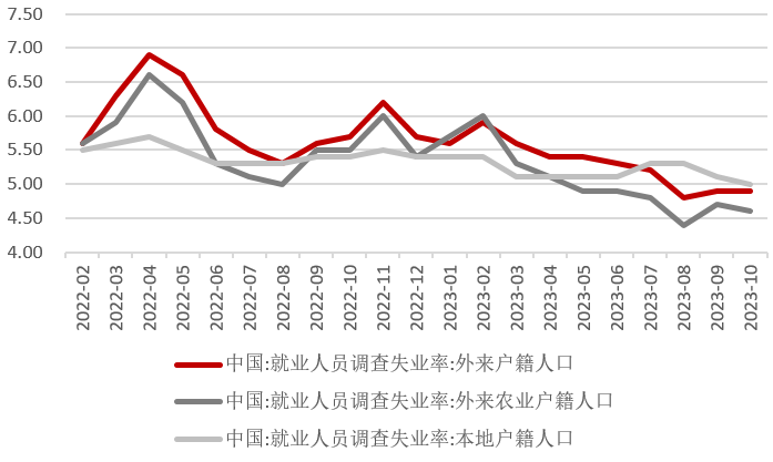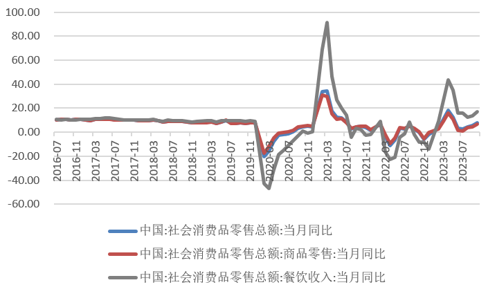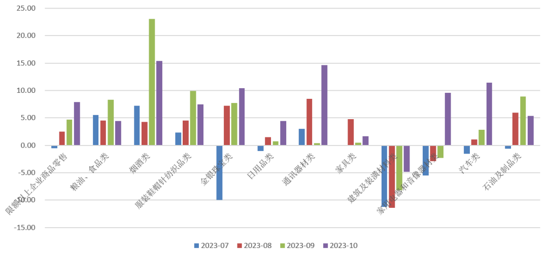 10月份,限额以上企业商品零售同比增长7.9%,增速较上个月回升3.2个百分点。从商品类别看,10月份超半数商品零售额增速比上月加快,其中汽车类、通讯器材类、家用电器和音像器材类以及日用品类等可选消费较上月有较大幅度增长,分别较上月上升8.6、14.2、11.9、3.7个百分点至11.4%、14.2%、11.9%、4.4%,对10月商品零售消费的贡献较为明显。而粮油、食品类、烟酒类、服装鞋帽针纺织品类等增速有所回落,分别较上月下降3.9、7.7、2.4个百分点至4.4%、15.4%、7.5%。与地产相关消费方面,除家电消费增长较好外,家具类和建筑及装潢材料类增速分别为1.7%和-4.8%,仍然较为疲弱。从就业角度来看,就业形势保持稳定,10月全国城镇调查失业率与上月持平在5.0%,但值得注意的是,31个大城市城镇调查失业率和外来农业户籍人口调查失业率分别从上月的5.2%和4.7%下降至5.0%和4.6%,且农民工失业率较城镇总体低0.4个百分点,农民工就业较强于城镇人口就业。总的来说,后续地产市场筑底回升以及居民收入和信心逐步改善,商品消费需求或将逐渐释放,预计四季度消费仍会延续前三季度恢复向好态势。就业规模及居民收入预期增加,也在一定程度上推动社零增速上行。下阶段,消费复苏的核心驱动因素仍为就业、预期、信心修复支持下的消费能力的提高。