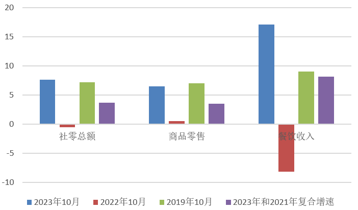 受政策持续发力显效、双节假期出行旅游需求旺盛以及低基数效应等因素提振,10月社会消费品零售总额同比增速明显回升。10月份,社会消费品零售总额43333亿元,同比增长7.6%,较上月上升2.1个百分点,增速连续3个月加快。其中,商品零售增速提升1.9个百分点至6.5%,餐饮收入增速提升3.3个百分点至17.1%。值得注意的是,社零当月同比从5.5%上升至7.6%,消费数据表现亮眼,但考虑到2020和2022年疫情带来的基数效应影响较大,剔除基数效应后, 2021和2023两年的社零总额复合同比增速为3.7%,仍较大幅度低于疫情前水平,消费或仍待提振。