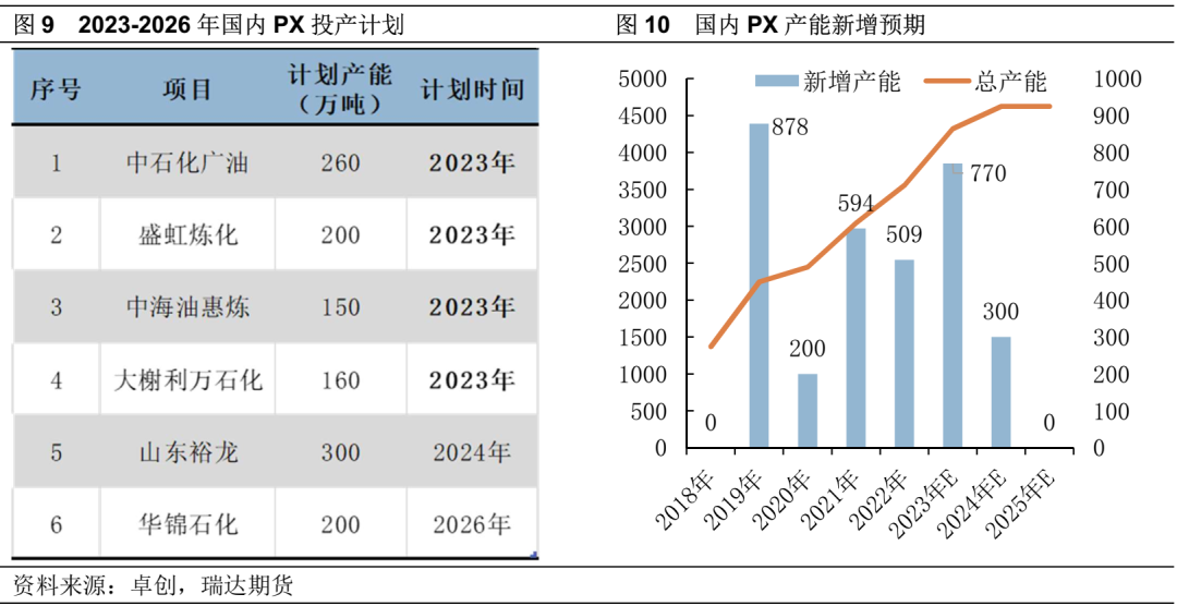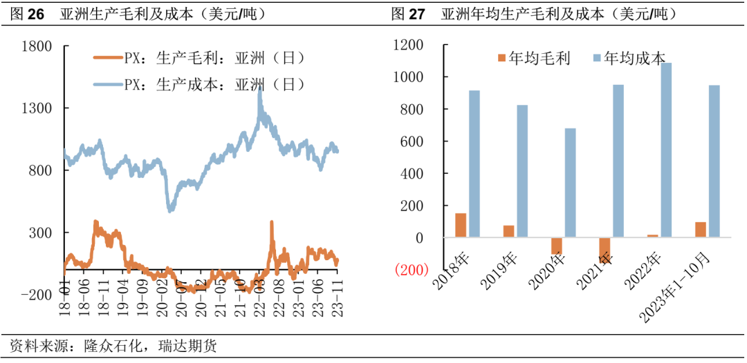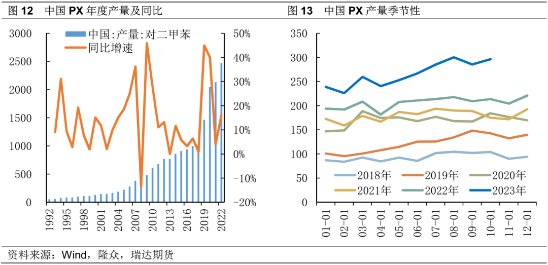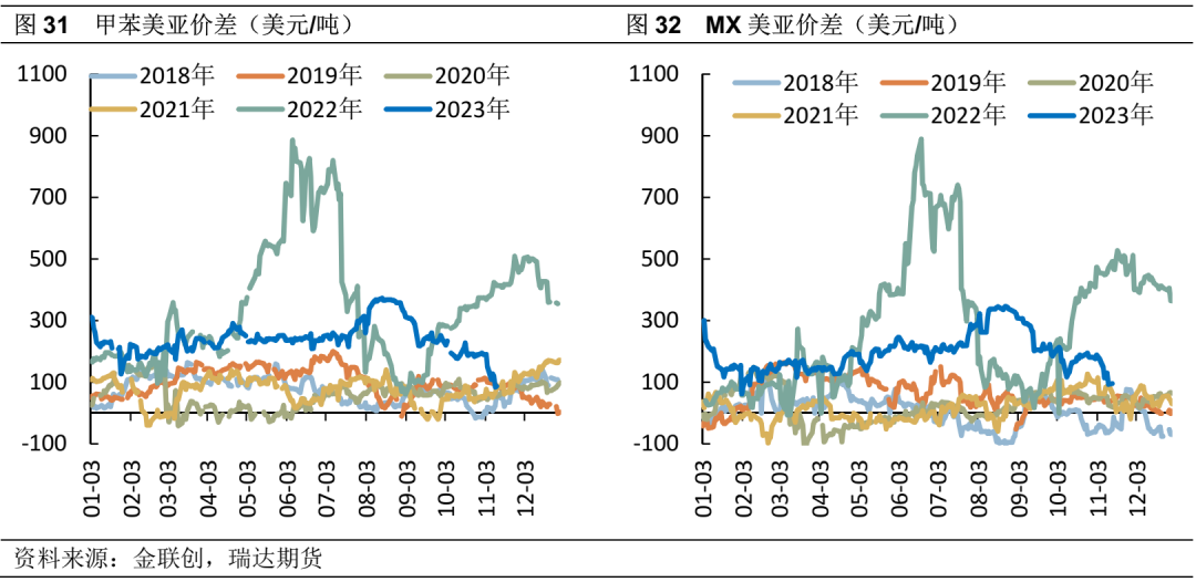 从产能利用率的走势来看,亚洲PX开工负荷持续走低,处于历史同期低位。中国方面,在新一轮投产周期下,工厂开工较为谨慎,且计划外检修时常发生,2023年上半年新投装置运行不稳定,且计划外检修较多,PX开工负荷处于历史低位运行,而实际产量得上升,主要由于产能基数扩大,随着装置运行稳定,开工率上升预计将进一步提升PX产量。