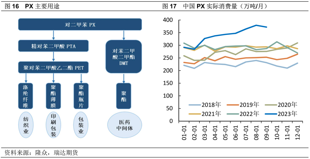 PX最主要的用途是加工生产PTA,是聚酯材料生产的重要原料,随着中国经济高速发展,服装、塑料等终端消费市场扩大,聚酯产业链迅速扩张,聚酯可用于生产涤纶纤维、聚酯瓶片和聚酯薄膜,进而应用于纺织、包装等领域。涤纶纤维除了应用于服装家纺,还可用于无纺布、运输带、轮胎等。据统计,中国超过99%的PX用于生产PTA,只有不到1%的PX用于生产DMT和其它材料,应用于医药、涂料等领域。受到下游聚酯纺织业的快速发展带动,PTA产能迅速扩张,对二甲苯需求也快速扩张,根据隆众数据,PX实际消费量2023年1-9月份平均339万吨/月,同比去年上涨15.7%。