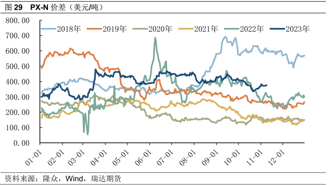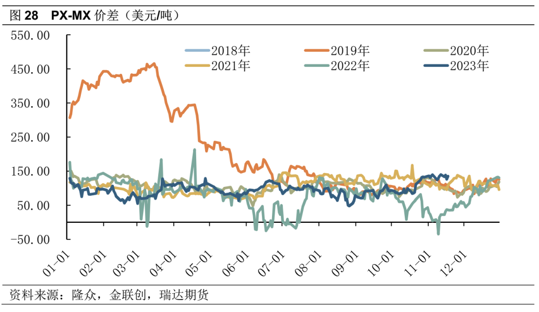 总体来看, PX价格除了自身供需影响外,还受到调油逻辑的影响,在汽油经济性更好时期,PX需要与调油争夺原料。冬季汽油消费相对偏淡,美国汽油调油需求弱,PX加工差处于相对偏高位置,PX-N和PX-MX存在压缩空间,整体供需偏弱,同时需要防范原油下行风险对PX的向下压力。