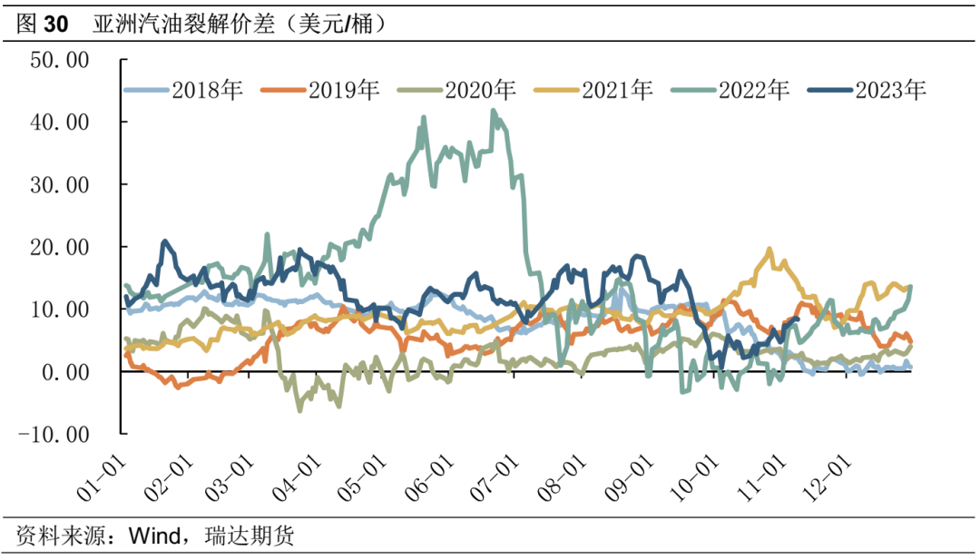 在PX的生产过程中,有一类组分不仅可以作为PX的化工原料,还可用于汽油的调和,比如重整汽油、甲苯以及MX,如上文PX生产流程图中所示。这类高辛烷值组分能作为汽油调油的优质原料,提高汽油的抗爆性。因此在汽油消费旺季、或者汽油裂解价差高企时,炼厂可调节化工用途和调油用途的装置比例,增加汽油调油组分的出率,而PX生产由于原料减少,产量相应缩减。在调油逻辑下,通常PX价格,PX-MX以及PX-N价差受到支撑。去年美国的汽油消费旺季,带动高辛烷值调油组分价格上涨,打开美亚套利价差并发生实际贸易。目前亚洲汽油裂解价差有所反弹,主要由于原油下行扩张价差,实际需求偏弱,因此目前调油逻辑对PX价格支撑有限。