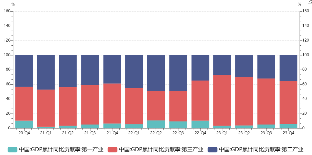与2022年相比,2023年国内经济整体呈现总量改善、价格承压的局面。在偏低的基数上,2023四季度GDP仅实现了5.2%的实际增速,低于市场预期。分产业看,四季度第一产业实际GDP增速较3季度持平于4.2%,而二、三产业实际GDP同比增速分别由4.6%/5.2%回升至5.5%/5.3%。第三产业的增长为经济主要拉动项,增速贡献占比达到60%以上。