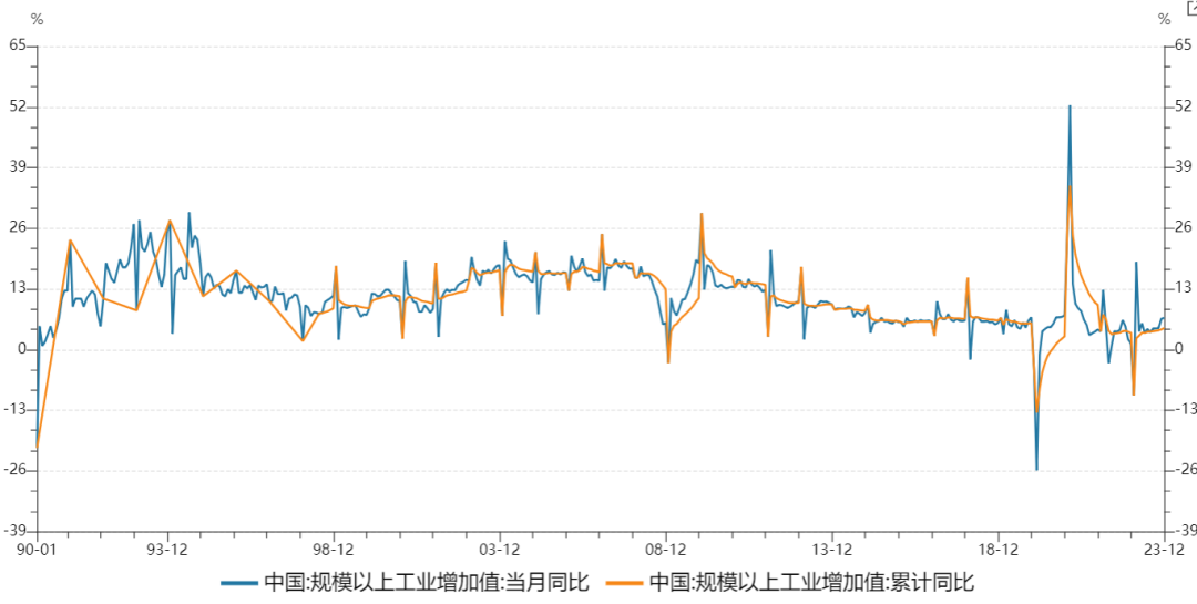 2024年1月17日,国家统计局公布数据,我国2023年GDP同比增长5.2%,前值6.3%,预期4.4%。12月份我国规模以上工业增加值同比增长6.8%,前值6.6%,预期6.6%。固定资产投资同比增长3.0%,前值2.9%,预期2.9%。其中,基础设施投资增长5.9%,制造业投资增长6.5%,房地产开发投资下降9.6%。社会消费品零售总额同比增长7.4%,前值10.1%,预期8.0%。全国城镇调查失业率为5.1%。