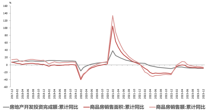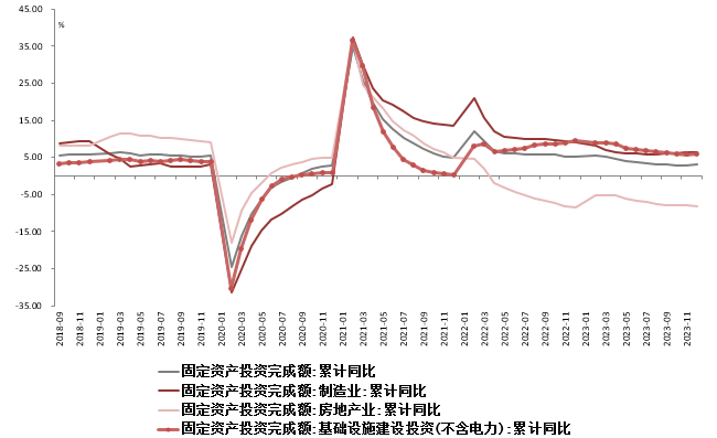 财政支出加快,推动基建回升。2023年全年基建投资增长5.9%(1-11月累计同比增速5.8%)。从分项看,12月公用事业、交运、水利环保和公共设施管理业投资增速分别为12.7%、7.7%和12.1%,其中水利环保和公共设施管理业投资增速较11月的-3.8%有明显好转,资金支持力度明显得到增强,或反映中央财政资金支出加快落实进而推动基建增速企稳。目前来看,2023年发布的1.25万亿特殊再融资、1万亿国债发行,将在2024年重点使用,并且叠加未来提前批专项债共同配合,都有助于地方债务化解和基建建设,今年基建投资有望保持较高增长,并在年初持续发力。