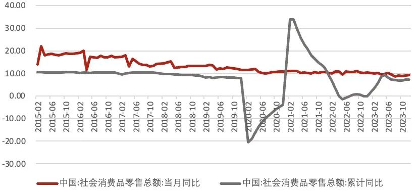 具体从需求端三驾马车来看:消费带动经济增速较为明显,全年社零同比明显回升,服务业消费较强。固定投资仍然拖累整体经济增长,由于地产周期仍处于下行阶段,地产投资增长仍待回升,制造业及基建投资回升平衡整体固定投资增速。出口需求一定程度上受到外需回落的影响,增速回升主要基于基数效应。