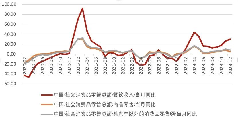 受12 月社零同比增长较上月下降 2.7 个百分点至7.4%。其中,除汽车以外的消费品零售额同比增长 7.9%,较 11 月下降 1.7 个百分点;商品零售、餐饮收入增速分别较11月上升1.3、下降1.7个百分点至2.3%、5.7%,从结构上看,服务消费表现持续好于商品零售,餐饮消费维持高增速。