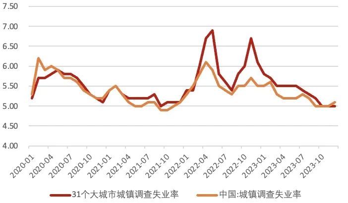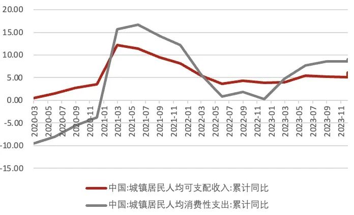 大城市就业明显改善,居民消费收入稳定。受部分行业生产经营淡季影响,就业需求或有所下降,12月城镇失业率较上月回升0.1个百分点至5.1%,打破了此前维持三个月的5%增速水平,为 2021年12月以来次低水平。31个大城市城镇调查失业率为5.0%,环比持平,同时低于全国城镇调查失业率0.1个百分点,较去年12月下降1.1个百分点,是2022年2月以来首次低于全国整体水平。此外,统计局将恢复发布不包含在校学生的分年龄段失业率,不包含在校生的 16—24 岁、25—29 岁、30—59 岁劳动力调查失业率分别为 14.9%、6.1%、3.9%。2023 年居民实际收入同比增长 6.1%。居民人均消费支出累计同比增长 9.0%。中央经济工作会议强调“要把恢复和扩大消费摆在优先位置。”后续稳增长促消费相关政策的出台需密切关注,同时居民收入增速和就业水平整体保持平稳,有有望支撑居民消费稳定复苏。