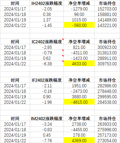 表1:股指期货近4个交易日涨跌持仓明细