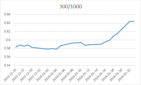一方面,单纯将指数下探归咎于外资卖出并不全面,虽然在1月17日,沪指回调跌破2800点关口,陆股通净卖出130亿元,1月22日指数跌破2700点关口,陆股通却净买入10.47亿元,北向资金卖出不能完整解释近日市场下探的原因。另一方面,近日市场中亦有预期挂钩雪球的中证500与1000股指是市场大跌的原因。诚然,随着500与1000股指下探,雪球产品面临集中敲入风险使得基差有贴水的趋势。然而对于整个市场而言,雪球敲入规模(每100点约导致100亿中证500及130亿中证1000雪球敲入)资金小于期指的成交量,更仅占沪深两市成交额的2.9%,雪球产品敲入的影响或更多集中在基差波动和情绪层面。实际上,股市目前或面临着资金负反馈的局面,近期公布经济数据表明增长继续修复过程中仍需政策加码应对;海外近期事件性因素偏多,投资者风险偏好降低,叠加市场已处于震荡低位,单一因素触发市场在下行过程中公募基金、私募基金面临清盘,导致整个市场被动式下探。此外,主动权益型基金近期赎回额度一直处于较高位,净申购长期处于负值,其大规模抛售和赎回让股指承压,进而加剧市场下行,各基金抛售力度进一步加大,形成“负反馈”。而雪球产品规模性敲入加剧了资产抛售和担忧情绪释放,引发更多套保性空单布局。当前基于短线行情,可以观测到IC/IM空单走阔,IH/IF空单收敛的特征。这或基于市场下行过程中,国家资金有一定的护盘需要,大规模的300etf成交,而多头方向的对冲头寸集中在中小盘股指端口,形成大盘股指短期支撑性相对强于中小盘的格局。同时,若后续指数再度寻底,IC/IM在雪球敲入影响下则难以避免净空单的大幅走阔。因而短线策略或可考虑跨品种价差持有,方向为多300空1000组合;或是通过期限套利,顺应贴水局势,实现多近空远盈利。