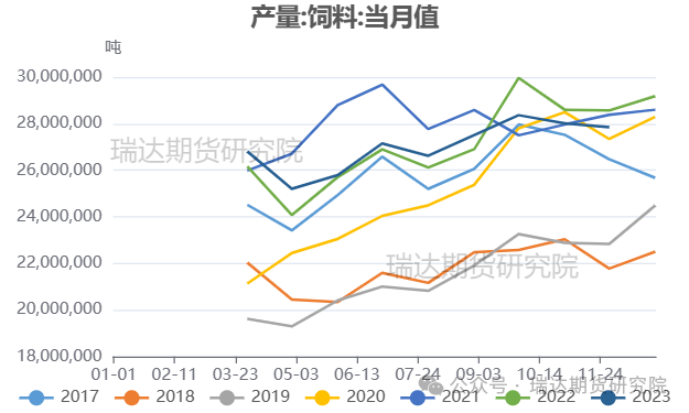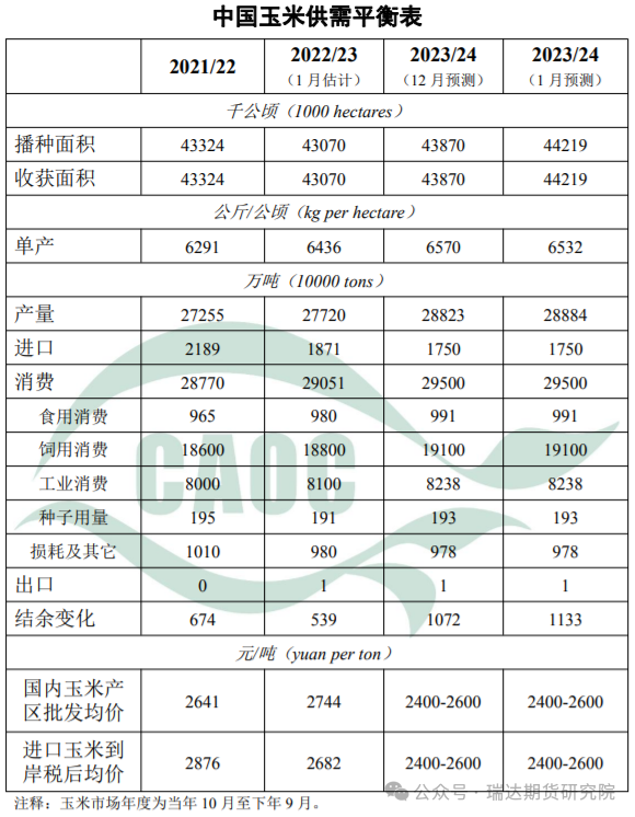 对于饲用需求最高的生猪市场而言,国家统计局数据显示,2023年末,全国生猪存栏43422万头,比上年末减少1833万头,下降4.1%。能繁母猪存栏4142万头,减少248万头,下降5.7%。去年年末的几个月,以华东、华中为代表的各省非瘟疫病加快了生猪市场的出栏,产能较前期下滑,饲料需求有所减弱。据中国饲料工业协会数据显示,2023年11月,全国工业饲料产量2665万吨,环比下降3.5%,同比下降1.5%。饲料企业生产的配合饲料中玉米用量占比为31.3%,同比下降5.0个百分点。由于养殖利润不佳,企业不仅降低饲料中玉米的用量占比,而且下游采购积极性较差,使得饲料产量也同步降低。尽管年前备货提振,生猪及白条供需矛盾缓和,加上其他不利天气等因素配合,猪价及肉价由弱转强,出现阶段性反弹。但春节后,根据历年屠宰量测算,春节后的屠宰场较节前增量后减少或达50%水平,而存栏仍然偏高,供应仍显得较为充裕,整体或表现为需求回落量大于生猪供应减量,仍处于供大于求的局面,不排除企业在高负债,低猪价的情况下,出现一定抛售现象,加速产能去化。对玉米需求较为不利。