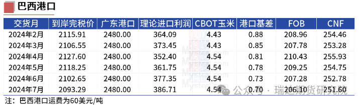 从全球玉米供需情况看,美国农业部(以下简称USDA)1月报告显示,全球2023/24年度玉米产量预估为12.3573亿吨,12月预估为12.2207亿吨。全球2023/24年度玉米期末库存预估为3.2522亿吨,12月预估为3.1522亿吨。全球玉米产量和期末库存均小幅上调,主要是USDA在本次报告中再度上调了美玉米单产和产量。纵向对比来看,本年度全球产量来到历史最高位,期末库存也回升至五年来最高。另外,尽管2月USDA月度报告发布前,各机构预估巴西玉米2023/24年度产量大概率会继续下调,预估均值为1.2432亿吨,但下调幅度较为有限,且阿根廷产量有望小幅上调,降低南美产量总体下降幅度,国际市场供应端持续承压。从进口价格来看,截止2月5日,船期2月至7月期间,美湾港口玉米进口到岸完税价在2150-2200元/吨之间,巴西港口到岸完税价在2100元/吨附近,明显低于国内广东港口价格,国际市场价格优势较好,利好国内进口采购端。