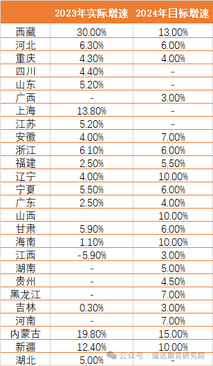 从全国来看,各省市加权GDP增速目标约为5.35%。按照往年规律来看,全国经济增速目标通常略低于地方0.5个百分点左右,预计今年全国经济增速目标或定为4.85%至5%。分区域来看,经济总量排名前六的省份中,除河南以及四川以外,广东、江苏、浙江以及山东经济增长目标均为上调或不变,加权平均为5.2%左右,相比去年上升0.08个百分点,符合中央经济工作会议“稳中求进、以进促稳、先立后破”发展主基调。而其余省市中有13个省份下调GDP增速目标,平均降幅0.48个百分点。回顾2023年全年,我国经济增长面临一定的压力。31个省份中,17个省份23年GDP同比增速未达年初制定的目标,这亦或是近年两会各省下调经济增速预期的原因。2024年各省将扩大内需、促进投资作为经济增长的重要发力点,多数省份强调了防范与化解重点领域风险问题,预计两会将继续围绕扩内需出台更多稳增长方面政策,对防风险领域亦或更为重视。2024年各省固定资产投资目标增速加权平均为5.7%,高风险省份增速目标降幅较大,经济大省的目标亦相对谨慎。回顾2023年,仅6省完成既定目标,固投增速方面各省份完成度较低。房地产投资市场未有明显好转,多数指标持续转弱,仍是投资端的首要拖累。居民端贷款表现差,排除季节性因素外也与内需不足相挂钩。尽管“认房不认贷”、降低首套二套首付比例、存量房贷利率降息等一系列政策频频落地,但效果仍不达预期,后续有较大复苏空间。此外,固定资产投资目标增速下滑的原因或是23年以来化债政策不断趋严,基建增速受地方城投平台融资明显受制有关。2024年,考虑到会议定调对防风险政策偏移,中央或继续强化地方政府融资平台债务融资管控,严禁违规为地方政府变相举债等举措。2023年四季度的增发国债和PSL发力对冲地方融资收紧的影响,同时考虑到部分省市将在今年推进“三大工程”开工建设,2024年固定资产投资实际增速仍有望回升。2024年各省消费目标均值为6.1%,在高基数下仍保持较高水平。从各大省份工作报告中看,文旅休闲、数字消费、绿色消费、汽车和消费电子是各地促消费的主要方向。预计2024年消费复苏有望实现从服务到耐用品、大件商品等领域的扩散,消费内生动能较去年稳步改善。回顾2023年,消费需求快速释放,得益于年初防疫政策的放开,细项当中其中餐饮收入表现亮眼。中央经济工作会议强调“要把恢复和扩大消费摆在优先位置。”后续两会对稳增长促消费相关政策仍将重点提及,同时随着居民收入增速和就业水平整体保持平稳,有望支撑2024年居民消费稳定复苏。