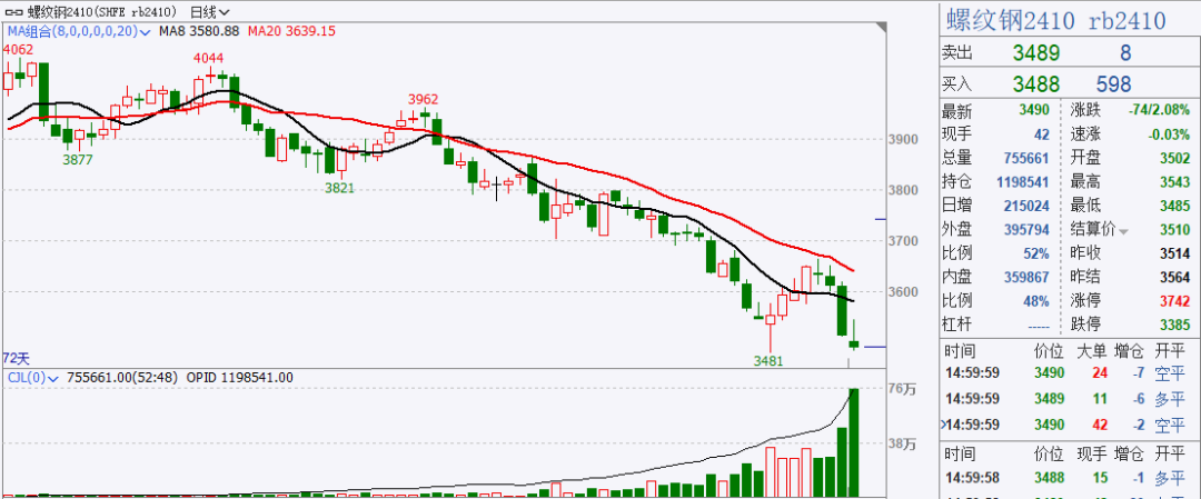 异动情况:2024年3月27日,上期所螺纹钢RB2410期货合约大幅增仓下行,截至收盘,RB2410合约日增仓215024手,而期货价格下跌幅度超过2%。