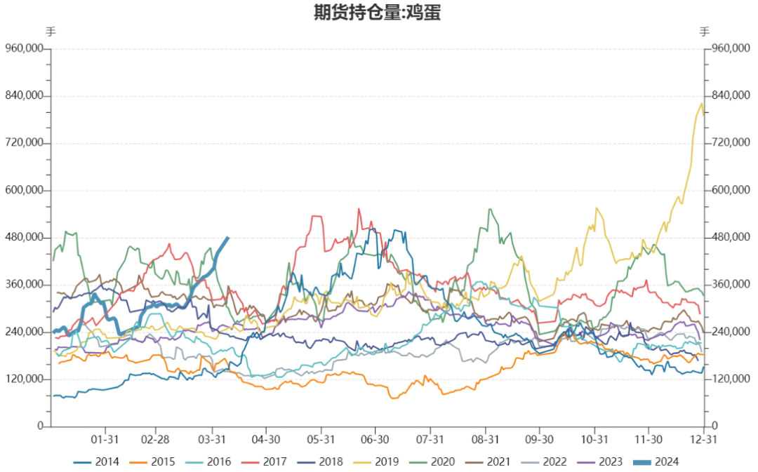 数据:自3月下旬以来,鸡蛋期货持仓量呈现明显的增加,截止4月9日收盘,鸡蛋期货持仓量达到482589手,来到历史同期最高位。本月前5个交易日共增仓约8万手,增幅达20%。