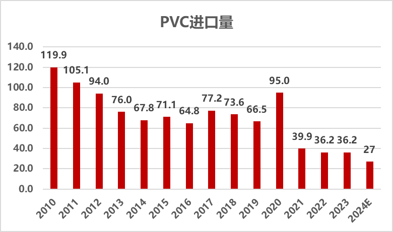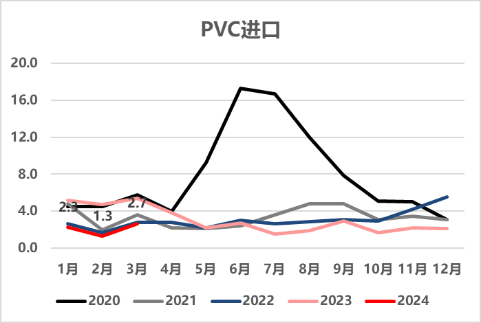 根据海关数据,2024年3月中国PVC进口量仅为2.66万吨,环比增长主要是受春节影响、同比看仍处于收缩状态。自2021年开始,随着国内PVC装置的陆续投产,PVC供应水平充足,进口体量持续缩减,进口量基本维持高端料补充或者转口或者内外盘套利,年度体量基本回落至30万吨附近水平。