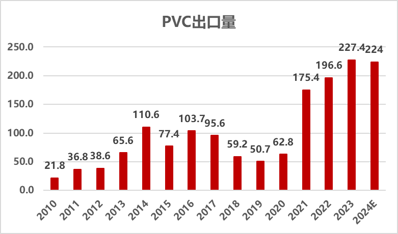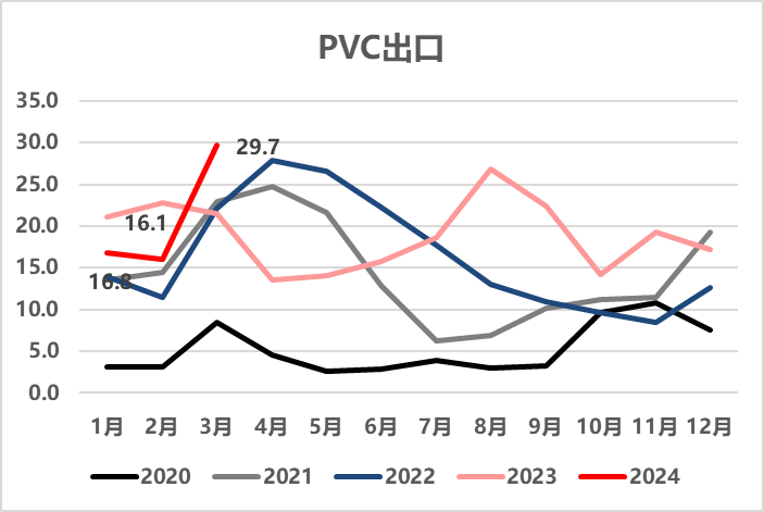 根据海关数据,2024年3月中国PVC出口量达29.7万吨,环比、同比均处于增长状态、出口表现仍超市场预期。随着2021年起国内PVC装置的陆续投产,内需转出口趋势显著,叠加海外能源成本高企问题以及印度新增市场需求,国内出口价格优势显著,出口体量持续增长。预计2024年出口量仍在200万吨以上,处于历年高位水平。
