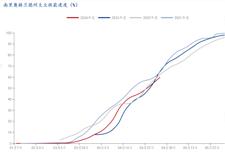 从巴西国家商品供应公司CONAB公布的收获数据来看,截止4月28日当周大豆收获进度60%,同比去年落后十个百分点。并且对比前三年的情况来看,南里奥格兰德州大豆收获进度明显偏慢。本周,USDA将公布最新的种植报告,前期美农对巴西的产量预估在1.55亿吨,持续高于市场平均预估,关注本次天气对美农报告可能的下调的影响。另外,除了巴西大豆产量可能面临的损失之外,短期巴西物流运输可能也将出现问题。市场此前预计南里奥格兰德州今年至少出口1000万吨大豆和400万吨豆粕,但洪水造成的道路受损可能会给履行合同带来困难。