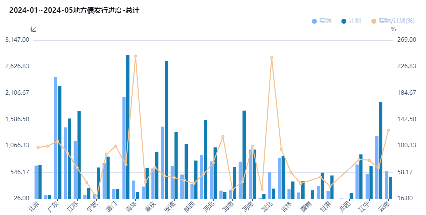 地方政府债发行节奏偏慢。截至本周,地方债发行进度为28.6%,其中专项债为25.5%,发行节奏较往年偏慢。从最新的发行计划来看,5月地方政府债预计发行8383亿元,6月地方债预计发行7336亿元,预计5-6月地方政府债合计发行近1.6万亿元。若发行计划全部完成,二季度末新增专项债发行进度可达40%,二季度地方政府债供给节奏依然偏慢,政府债或在三季度密集发行,若特殊再融资债券也在三季度发行,叠加特别国债发行,则三季度迎来债券发行高峰,会对市场带来一定冲击。