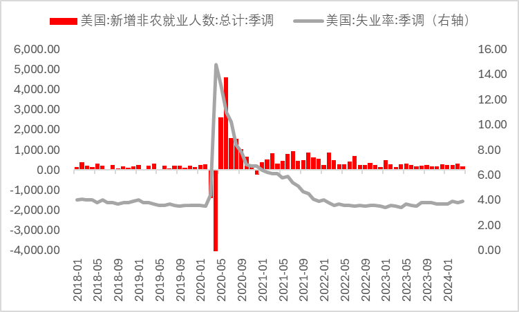 原因1:自5月以来,美国非农就业数据以及通胀数据均超预期走弱,非农就业数据方面,美国4月非农新增就业人数录得17.5万人,低于预期的24万人及前值31.5万人,失业率同样由3.8%上升至3.9%,高于预期的3.8%。前期作为新增就业人数主要推手的服务业劳需求或进一步走弱,而这也进一步反映在持续放缓的薪资增速上(4月平均时薪同比增速3.9%,预期4%,前值4.1%)。在劳动力需求下降的情况下,劳动力市场接纳度回落或导致未来工人薪资议价权或有所转弱,整体居民收入减少或有利削弱经济消费能力,相关核心价格或失去相应支撑。