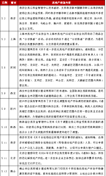 自4月30日政治局会议明确“统筹研究消化存量房产和优化增量住房的政策措施”以来,地产政策的进一步松绑也成为节后市场热议的话题。5月17日各项政策陆续推出,央行、国家金监总局发布通知涉及首付比例,下调住房公积金贷款利率,以及取消首套、二套房贷款利率政策下限,并设立3000医院保障性住房再贷款,支持地方政府从实际出发,酌情以收回、收购等方式妥善处置已出让的闲置存量住宅用地,以帮助资金困难房企解困。政策的出台带动着市场预期的改善,在刺激地产产业链相关上市公司股价的同时,也带动了包括有色金属、螺纹钢、PVC、PTA等商品期货价格应声上涨,但回顾上一轮地产去库存,相关期货价格的持续性仍由其基本面改善因素决定。一、下调首付比例5个百分点,首套从20%降到15%,二套房从30%降至25%;个人公积金利率下调0.25%;取消商贷利率政策下限。(1)15%首付比例是自从1998年房改以来的最低首付比例,降低首付可以降低置业门槛,意味着居民杠杆率也将迎来提升,同时可以吸引更多刚需或潜在的购房者进入房地产市场,有助于提升市场交易量,提升市场的活跃度。这一举措对北上广深等少数大城市效果较为显著,降低首付比例的同时也意味着买房杠杆达到6.6倍,房价下跌15%就会变成负资产。在未来预期不明的情况下,居民对加杠杆大多保持谨慎态度。这意味着购房者需要支付的初始资金减少。这可以吸引更多的潜在购房者进入市场,尤其是那些原本因首付压力较大而犹豫不决的购房者。首付门槛的降低有助于提升市场交易量,对于拉动市场交易具有明显作用。(2)取消商贷利率政策下限,并将个人公积金利率下调0.25%,5年以内公积金贷款利率调整为2.35%,5年以上降至2.85%,均创历史新低,低于部分经营贷。这将使得购房者的贷款成本降低,刺激购房需求。自2023年1月以来各地实质上已经开始突破房贷利率下限,截至4月末,全国343个城市中已经有67个取消了首套房贷款利率下限,此次全面取消住房贷款利率下限有望带动更多城市取消利率下限。需要注意的是,当前存量按揭人的商业房贷利率相对新房仍处于高位,提前款还压力仍有可能对银行带来影响,若未改善降低,居民提前还贷潮料将持续,或导致潜在购房者继续观望,后续不排除通过进一步调整LPR利率减轻存量房贷压力。以上首付与贷款利率双重降低的三项政策主要是针对居民端的购房支持政策,本质是刺激潜在购房群体继续加杠杆来实现去化,助于促进交易量的增加,进一步推动房地产市场的稳定发展。,但政策调整能否对市场需求侧形成明显刺激仍有待观察。当前全国(除了北京)首套房利率进入3%+时代,回顾2014-2016年周期,从基准利率下调的幅度、房贷利率打折水平来看,政策调整并非一蹴而就,而商品房市场的回暖进程相对政策落地相对滞后。二、央行设立3000亿元保障性住房再贷款,可带动银行贷款5000亿元,支持地方国有企业以合理价格收购已建成未出售的商品房,用作配售型或配租型保障性住房。(1)3000亿元保障性住房再贷款,利率1.75%,期限1年,可以展期4次。央行按照贷款本金60%向全国21家银行发放再贷款,银行再向地方国有企业发放贷款,可带动银行贷款5000亿元。虽然此次再贷款整体体量不大,但释放的信号较为明确,通过降低融资成本,有利于政策的可行性,推动金融机构对相关项目的支持。(2)本次政策明确收购主体是地方国企,收购目标是房地产企业已建成未出售的商品房,可以帮助新房去库存。在严控地方政府债务风险的背景下,政策明确规定了收购主体不得涉及隐债、也不的为政府融资平台,在控制地方政府债务的同时限制也将有助于相关项目再贷款资金更好的用于相关项目。当下我国房地产供求关系已发生较大改变,通过政府回购不仅能加快商品房去化,还能提高保障性住房的供给量,满足居民的住房需求,加快房地产市场供需格局的转变。三、政府收储托底,可避免短期内楼市断崖式下滑,有托举和稳定预期的作用,也可化解城投的风险,资金的规模和持续性是关键。(1)最近几年各地城投拿地托底,积累了大量未开放土地,现在根据收储需求开发,地方政府再根据市场价格收购用作公租房,可以释放城投风险,且减少银行系统内风险的堆积。(2)政府收储早有先例,过去市场以旧换新,是国资收购二手房让购房者买新房,如郑州,10000套以旧换新名额中,5000套是郑州国资收购的。现在的政策是收购已建成未出售的商品房,主要是为了新房去库存。(3)政府收储有两个关键问题:资金从何而来?收益如何覆盖成本?资金方面,地方财政、城投平台自筹资金、租赁房贷支持计划是主要资金来源,本次设立3000亿元保障性住房再贷款,补充了资金来源,地方政府专项债、特别国债也是资金来源,但是仍然不足以支撑全国推广收储,预计在高库存的城市落地,去库存效果不如当年棚改货币化。目前国内超过20个月,截止今年四月商品房待售面积达到74553万平方米。根据市场人士测试,针对新房市场,政府收储连续3年,每年5万亿规模,若连续3年,累计7-10万亿资金。收益方面,目前大部分城市的租金回报率不高,收储用作保障房或租赁房或面临成本覆盖的压力。四、在央行调整公积金贷款利率政策发布后,多地住房公积金中心积极响应,纷纷下调公积金贷款利率。其中包括北京、上海、深圳、广州、东莞、中山、江门、汕