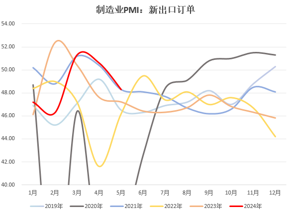 需求端,新订单、新出口订单指数均较上月回落。其中,新订单指数回落1.5个百分点至49.6,新出口订单指数回落2.3个百分点至48.3,内外需共同下行或反应我国经济复苏基础仍不牢固。但从5月各国PMI数据来看,多数国家持续好转,外需或处于边际改善趋势中。