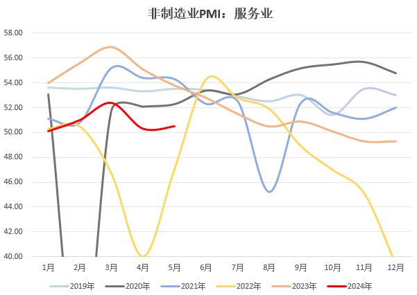 5月31日,国家统计局公布数据,5月官方制造业PMI录得49.5,前值50.4,预期50.4;非制造业PMI51.1,前值51.2,预期51.5。其中,服务业PMI录得50.5,建筑业PMI录得54.4。