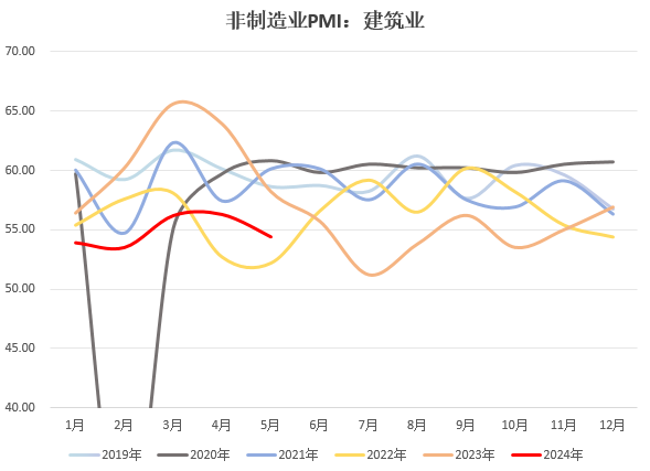 三、非制造业PMI较上月回落0.1个百分点,与上月基本持平。伴随五一假日来临,居民出行需求回暖带动服务业表现超预期。5月服务业PMI录得50.5,较上月回升0.2个百分点。其中,与节日出行和消费密切相关的行业生产经营较为活跃,航空运输业、餐饮业、电信广播电视、文化体育娱乐增长迅速,带动整体服务业商务活动指数改善。预计假期效应消退后,服务业PMI或小幅回落。5月建筑业PMI环比回落1.9至54.4,或受节日因素以及年初以来地方债发行节奏偏慢影响,仍待专项债、特别国债进一步落实。而在房地产政策频频出台后,房地产相关指标边际好转,但始终位于历史较低位置。后续随着超长期特别国债开始发行、专项债发行提速,建筑业景气度料逐步回升。