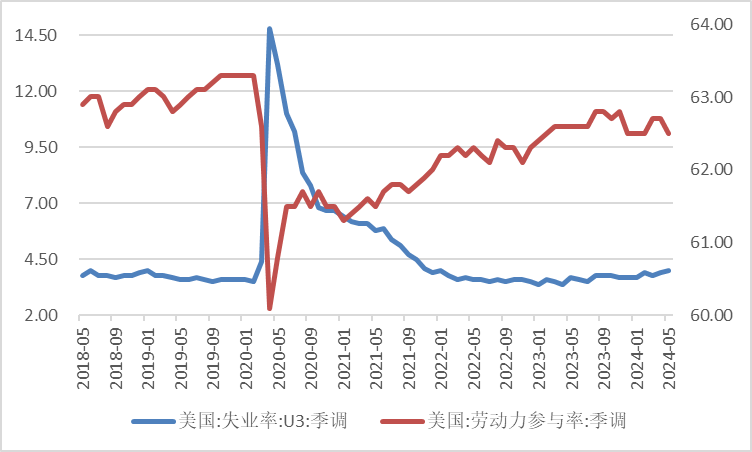 5月份美国非农就业人口15854.3万人,较4月增加27.2万人;U3失业率上升0.1%至4%,创2022年1月以来新高,同时劳动参与率下降0.2%至62.5%。失业率及劳动参与率的变化与新增非农数据大幅走高形成明显反差。