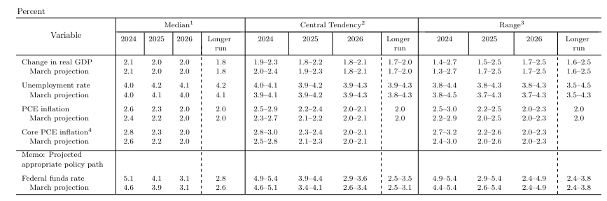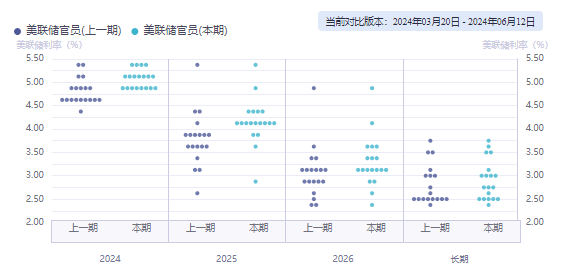 美联储在本次会议上发布了新的经济预测,其中对年内(2.1%)及未来两年经济增速的预期(2.0%)维持不变,年内失业率预期仍为4%,但分别将明后两年的失业率预期上调了0.1%(2025年:4.2%,2026年:4.1%);最后,美联储上调了今明两年的整体通胀以及核心通胀预期,年内通胀及核心通胀预期分别上调0.2%至2.6%及2.8%。从本次经济预测的调整来看,美联储或相对下调了对未来通胀放缓的期望,年内通胀预期不断上修也体现出整体劳动力市场及经济对价格水平的支撑。从失业率预期来看,美联储或预测年内劳动力市场或多将持续当前供需再平衡过程,然而当前失业率已接近预测值,未来失业率若受需求显著走弱大幅上涨或相对上调年内降息概率。