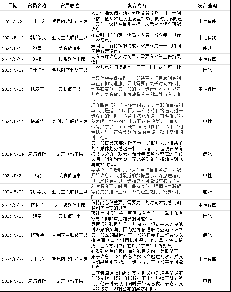 在点阵图方面,年内政策利率预期中值较3月有所上调,与此同时,年内支持不降息或降息一次的美联储官员人数显著上升,当前支持年内不降息的官员上升至4人,而支持降息一次的人数则由2人上升至7人。结合经济预测变化来看,美联储官员对后继美国通胀粘性预期有所升高,其对核心通胀水平是否能回落至正常水平的判断也更加谨慎,这也使更多官员在近期公开发言中表达对降息看法较为谨慎的态度,年内整体降息空间进一步受到挤压。