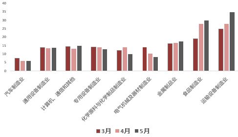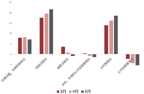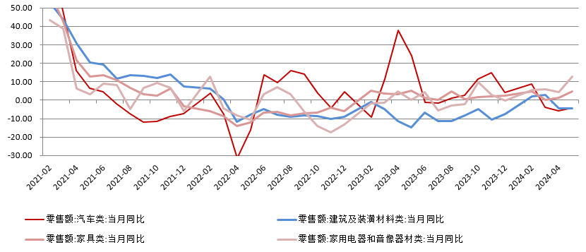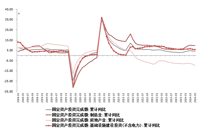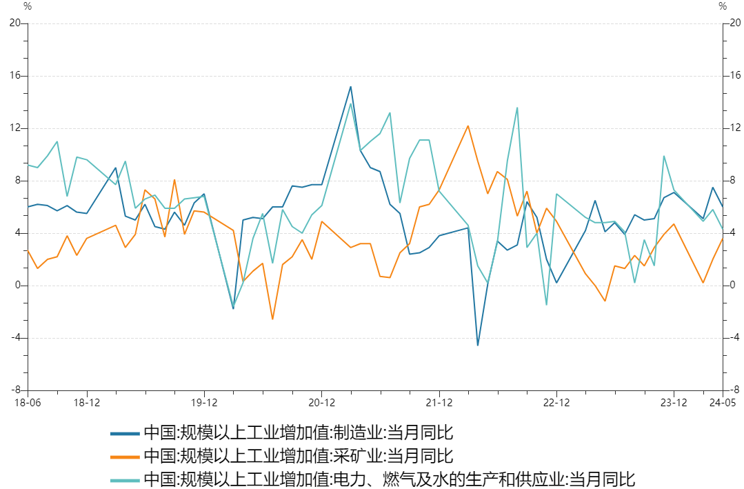 6月17日,国家统计局公布数据,5月规模以上工业增加值同比增长5.6%,前值6.7%,预期6%。固定资产投资同比增长4.0%,前值4.2%。其中,基础设施投资同比增长5.7%,制造业投资增长9.6%,房地产开发投资下降10.1%。社会消费品零售总额同比增长3.7%,前值2.3%。全国调查失业率5.0,%,前值5.0%。一、工业生产持续受出口拉动。5月份,全国规模以上工业增加值同比增长5.6%,增速回落1.1个百分点;环比增长0.30%,工业生产总体平稳发展。分三大门类看,采矿业增加值同比增长3.6%,制造业增长6.0%,电力、热力、燃气及水生产和供应业增长4.3%。从产品看,出口相关产业链及装备制造领域产品均维持高增,新能源汽车、集成电路、工业机器人等产品均保持高速增长。目前,新能源汽车产销和出口同比继续保持快速增长,汽车行业以旧换新等有关政策仍在深入实施,市场消费潜能有望进一步扩大,带动装备制造增速维持高增。整体来看,工业增长受益于年初以来“设备更新”落地效果不断显现,规模以上工业企业利润同比增速连续三个季度增长,企业信心稳步回升,工业经济在政策扶持下持续改善。展望后续,预计今年工业稳增长政策或呈现力度前置发力的节奏,在经济内生动力恢复后增速料转向平稳。二、固定资产投资小幅走弱,地产景气仍待提升。1-5月固定资产投资增速为4.0%,较上月小幅回落0.2个百分点;扣除房地产开发投资,全国固定资产投资增长8.6%。不过根据历史规律来看,近十年投资增速总体呈前高后低态势,后续态势需进一步观察。分领域看,基础设施投资同比增长5.7%,制造业投资增长9.6%,房地产开发投资下降10.1%。1-5月制造业投资增速仍然处于高位,新质生产力相关的高技术产业投资维持较高增速,高技术产业投资同比增长11.5%。铁路仍作为基建投资增长的主要驱动力,整体道路投资同比转负。出口相关产业投资处于高位,如铁路、船舶、航空航天和其他运输设备、电子设备、专用设备和通用设备同比增速走高。基建投资中,受万亿国债托底的水利管理继续维持扩张,而与专项债关联较高的公共设施投资增速回落,专项债发行进度过慢对基建投资的拖累已有所体现。截止5月份,专项债发行进度仅约30%,远不及过往平均量,但较1-4月已明显加速,后续或进一步改善。房地产仍在持续调整。1-5月全国房地产开发投资同比下降10.1%,降幅继续扩大0.3个百分点,开工、竣工面积保持-20%增速。虽然在“517”一揽子去库存政策落地后,新房销售小幅改善,全国商品房销售面积和金额同比从-22.8%和-30.4%小幅收窄至-20.7%和-26.4%,但70城新建住宅价格同比环比降幅均继续走阔,销售端量价依旧低迷,居民购房意愿未见明显提升。从资金来源看,跌幅较大的是个人按揭贷款,大幅下降40.2%(前值-39.7%),销售回款能力大幅恶化。尽管地产新政力度进一步加大,但效果仍不达预期,后续有较大复苏空间。同时,黑色系价格能否在六轮降价后止跌仍需观察,若疲态延续,则地产投资料进一步走低。综上,从1-5月的整体投资状况来看,房地产仍然偏弱,而财政资金和项目端仍偏慢,基建增速受专项债拖累明显,使整体投资增速承压。三、消费超预期好转,升级类商品改善明显。5月社会消费品零售总额同比增长3.7%,比上月加快1.4个百分点;环比0.51%。4月社零增速由于假期错月带来的高基数而回落较大,5月随着高基数影响消退,外加五一假期的拉动从而形成正向支撑,涨幅高于预期。在居民收入增速偏低的情况下,居民消费模式发生转变,商品消费增速持续低于餐饮收入。5月份商品零售增速3.6%,较上月回升1.6个百分比,餐饮消费5.0%,继续上涨。“618”活动提前带动商品网上零售额当月同比增长12.9%,限额以上单位体育、娱乐用品,化妆品,通讯器材等升级类商品零售额均超两位数增长。而汽车消费高基数对整体消费增长的影响仍在延续,汽车消费增长-4%,扣除汽车消费增速后,社零总额增长为4.7%,提升0.8个百分点,消费动能持续优化。后续来看,消费需求的回升仍需等待政策出台以及房地产的好转。新一轮消费刺激政策酝酿实施,财政在税收方面优惠或主要是涉及家用电器、汽车等以旧换新。此外,居民自身消费模式继续变化,旅游消费已经成为引领消费增长的主要变量。就业方面,1-5月全国城镇调查失业率平均值为5.1%;5月失业率为5.0%,与上月持平,比上年同期下降0.2个百分点。截至5月份,就业下沉的现象有所缓解,随着政策逐步将经济引导至新质生产力,劳动力市场结构性失衡将持续修复。
