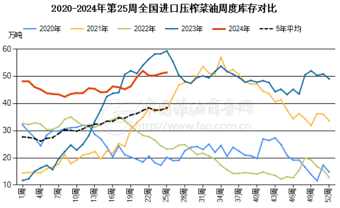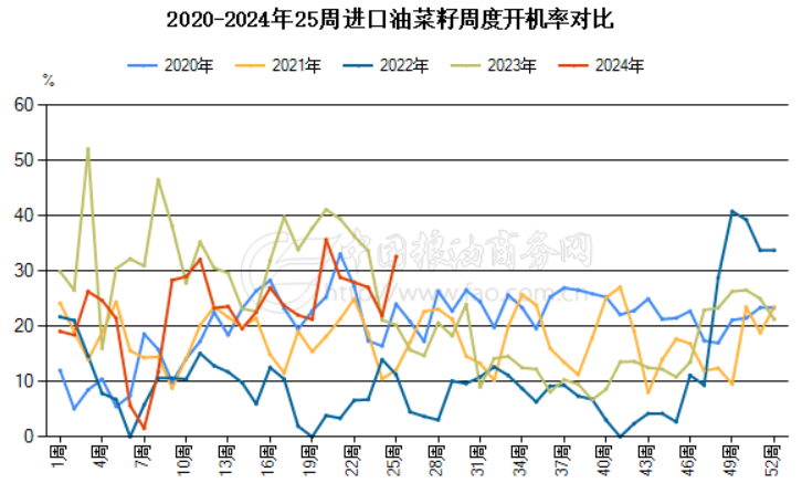 数据看点1:今年以来,国内进口压榨菜油库存持续处于同期高位,前期基本在40-50万吨的区间内窄幅波动,近一个月来维持在50万吨上方,整体库存压力相对较高。从上游的菜籽进口到港以及油厂开机率来看,截止第25周,进口油菜籽加工量为12.65万吨,开机率为32.62%,处于近五年来最高位。同时,截止6月22日,本月油菜籽累积到港量约为51.7万吨。现阶段菜籽供应仍然较为充裕,叠加压榨利润向好,油厂开机率有望继续维持高位,菜油供应端压力仍存。