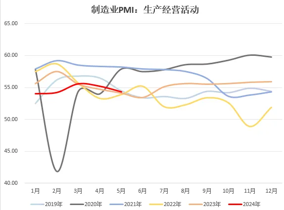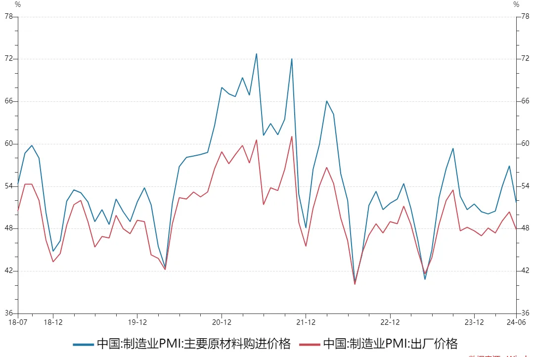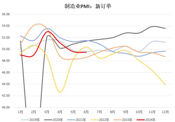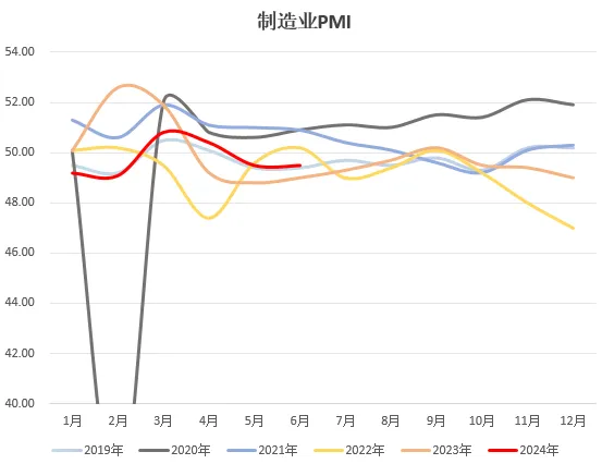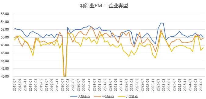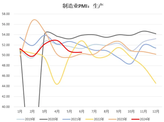 6月30日,国家统计局公布数据,6月官方制造业PMI录得49.5,前值49.5,预期49.5;非制造业PMI50.5,前值51.1,预期51。其中,服务业PMI录得50.2,建筑业PMI录得52.3。一、内需较弱掣肘生产意愿,6月制造业PMI低于历史均值。制造业PMI与上月持平,但低于季节性水平(2016-19年均值50.7)。今年上半年,制造业PMI先升后降,总体保持稳定。供给端,6月生产指数环比下降0.2至50.6,虽有回落但仍于扩张区间运行,需求不足反过来使得生产意愿回落。按企业规模看,大型企业景气度下行,而中、小企业景气度小幅回暖,但尚未升至扩张区间,结构仍未转变,中小企业承压的处境未发生改变,静待相关政策进一步发力。值得注意的是,新动能进一步发力,高技术制造业PMI为52.3,环比升1.6个百分点;装备制造业PMI环比升0.3个百分点至51,为本月制造业生产主要动能。二、外需仍是支撑制造业的主要因素。6月份新订单、新出口订单指数与上月基本持平。其中,新订单指数回落0.1个百分点,新出口订单指数维持48.3,内外需仍有回升空间,我国经济复苏基础仍不牢固。但从6月各国PMI数据来看,多数国家持续好转,外需或处于边际改善趋势中。今年中国出口面临的整体外需环境较为稳健,下半年或持续支撑我国生产。三、价格指数迅速回落。6月原材料价格指数和出厂价格分别下降5.2和2.5个百分点至51.7和47.9,成本压力明显回落。原材料购进价格指数与出厂价格指数的差值从6.5缩窄至3.8,上下游利润分化的问题得到缓解。同时,产成品库存回升1.8个百分点,原材料库存下降0.2个百分点。在需求较弱的背景下,预计企业库存可能仍低位运行,新一轮补库速度或有所放缓。四、非制造业PMI较上月回落0.6个百分点。随着假期效应褪去,整体非制造业PMI如预期般回落。6月服务业PMI录得50.2,较上月回落0.3个百分点。其中,与文旅相关行业回落最为明显,服务业支撑动力主要来自货币金融服务业,季度末市场需求集中释放可能是主要原因。五、天气因素和专项债投放偏慢导致基建偏弱。6月建筑业PMI环比下降2.1个百分点至52.3,环比变化和绝对水平均弱于季节性。虽然房地产政策频频出台,但是房地产相关行业整体仍然偏弱,呈现低位运行趋势。而基建相关的土木工程建筑业环比下降2个百分点,或与南方持续将于影响施工有关,叠加年初以来地方债发行节奏偏慢影响,景气度下行。随着专项债发行提速,建筑业景气度有望回升。总的来看,6月PMI延续了“供强需弱”的特征,并且价格压力明显缓解,中小企业景气度得到改善。而服务业在节日效应褪去后回落,支撑动力主要来自货币金融服务业和新动能相关行业;建筑业仍受地方债发行节奏偏慢影响季节性回落,后续有望回升。