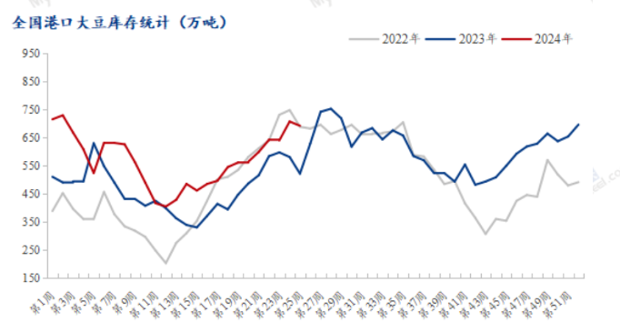 美豆种植进展顺利,种植面积增加,优良率良好,大幅高于五年平均水平,市场预期美豆丰产,同时传统需求淡季来临,贸易商走货不畅,美豆价格回落,跌破1100美分/蒲整数支撑位。国内豆类受此影响,也出现明显的回落,豆粕从5月底最高3659元/吨,跌至最低3432元/吨,跌幅6.6%。短期利空落地,受极端天气扰动,豆粕价格暂时低位震荡,后市走势几何?首先,美豆种植面积有所增加,美国农业部6月发布的数据显示,美国2024年大豆种植面积为8,610万英亩,同比2023年实际种植面积为8360万英亩增长250万英亩。其次,美豆种植进展顺利,优良率、出苗率和开花率均高于五年平均水平,USDA作物进展周报显示,截至6月30日,美国大豆优良率为67%,市场预估为66%,之前一周为67%,去年同期为50%;大豆出苗率为95%,之前一周为90%,上年同期为97%,五年均值为93%;大豆开花率为20%,之前一周为8%,去年同期为20%,五年均值为15%;最后,今年大豆主产区受干旱影响大幅降低,美国农业部干旱报告显示,截至6月25日当周,约7%的美国大豆种植区域受到干旱影响,而此前一周为2%,去年同期为63%。其中重度干旱率仍为0,整体情况良好。这可能意味着美国中部的夏季炎热和干燥程度低于此前预期,对美豆的生长较为有利,预计产量维持高位的概率较高。据Mysteel农产品调研显示,截至2024年06月21日,全国港口大豆库存692.27万吨,同比去年增加170.62万吨;油厂豆粕库存为96.77万吨,同比去年增加20.02万吨,增幅26.28%。同时7月国内油厂大豆供给依旧偏高,国内豆粕供给充足。根据中国粮油商务网跟踪统计的数据显示,2024年7月大豆到港量为934.2万吨,较去年同期882.2万吨的到港船期量增加52万吨,同比变化为5.89%。这样2024年1-7月的大豆到港预估量为5445.1万吨,去年同期累计到港量预估为5410.4万吨,增加34.7万吨;2023/2024年度大豆目前累计到港量预估为7849.9万吨,上年度同期的到港量为7649万吨,增加200.9万吨。预计在7月油厂大豆充足,开机率维持相对高位的局面下,油厂豆粕出库压力大,催提压力仍将持续,而贸易商和饲料厂由于此前采购的豆粕基差成本普遍较当前豆粕市场一口价高,因此,多地油厂将面临胀库压力。2023年生猪价格持续低迷,养殖端亏损严重,一定程度上打击了养殖户的信心,虽然二季度生猪价格小幅回暖,但存栏量还未恢复,据 Mysteel 农产品 208 家定点样本企业数据统计,其中123 家规模养殖场5月份能繁母猪存栏量为 487.59 万头,环比涨 0.38%,同比降4.24%。同时,禽料今年肉鸡利润削弱,价格处于近年低点,养殖获利困难,据Mysteel农产品调研显示,2024年5月,全国工业饲料产量2513万吨,环比增长3.7%,同比下降7.5%;5月饲料产量数据虽环比增长,但今年年初以来饲料需求整体疲软。综合来看,6月的USDA报告,美豆产量预计维持高位,美豆价格下跌;7月进口大豆大幅增加,油厂开机率高位运行,豆粕出库压力大,油厂将面临胀库压力;下游养殖利润下降,打击养殖信心,饲料需求整体疲软,豆粕或将继续向下寻找支撑位。期货从业资格号F3073708 期货投资咨询从业证书号Z0017638本报告中的信息均来源于公开可获得资料,瑞达期货股份有限公司力求准确可靠,但对这些信息的准确性及完整性不做任何保证,据此投资,责任自负。本报告不构成个人投资建议,客户应考虑本报告中的任何意见或建议是否符合其特定状况。本报告版权仅为我公司所有,未经书面许可,任何机构和个人不得以任何形式翻版、复制和发布。如引用、刊发,需注明出处为瑞达期货股份有限公司研究院,且不得对本报告进行有悖原意的引用、删节和修改。