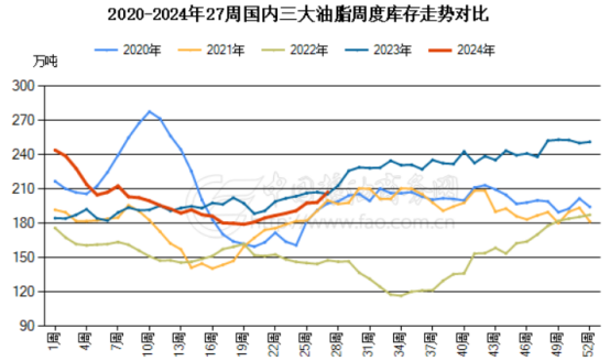 7月10日,菜油期货主力2409合约放量增仓大跌,持仓量增加9677手,成交量达83.87万,盘中最大跌幅超4.7%。截止收盘期价报8305元/吨,当日跌幅3.81%,再度回落至6月下旬低位附近。加拿大统计局在上月末发布报告中称,2024年加拿大油菜籽种植面积估计为2200.7万英亩,高于3月份估计的2139.4万英亩,比上年的2208.2万英亩减少0.3%。报告发布前,分析师预期油菜籽面积为2152万英亩。同时,当前油菜籽播种基本结束,大部分油菜处于苗期。尽管前期一些地区经历了暴雨、大风、冰雹和霜冻等天气,给油菜带来了一定的破坏,且频繁的降雨和过多的积水也导致作物出现叶病和根腐病,但是影响的地区不大,造成的损失较小,且近来气温回升至正常水平之上,降水也有所减少,一定程度上会让土壤中过多的水分减少,改善土壤墒情。总体来说,加拿大未来天气对于油菜的生长是利好的。种植面积高于预期且天气状况保持良好,提升加籽产量前景,给国际菜籽市场价格带来压力。另外,美豆现阶段也步入天气影响的关键期,今年在气候模式快速转换的情况下,市场给予较高升水的预期。然而从目前具体状况来看,美国农业部(USDA)在每周作物生长报告中公布称,截至2024年7月7日当周,美国大豆优良率为68%,高于市场预期的67%,前一周为67%,上年同期为51%。并且美国农业部气象学家布拉德·里皮认为,对美国中西部大部分地区来说,7月份的天气看起来相当有利,他认为今年作物可能不会经历酷热天气。美国全国海洋大气管理局(NOAA)预测,目前滞留美国各地的高压脊将会带来更多降雨机会。对于中西部几乎所有其他地区来说,今年7月份会有好消息,会出现分散的大范围降雨。无论是美豆的优良率还是后期的天气预期均表现良好,减弱因天气发酵带来的扰动情绪。国内市场而言,进口菜籽和大豆的到港量持续较高,油厂开机率保持高位,菜豆油供应均较为充裕,同样棕榈油也随着买船的增加,供应也明显增多,而油脂需求淡季,下游提货支撑力度有限,使得油脂库存连续回升至近年来最高位。中国粮油商务网监测数据显示,截止到2024年第27周末,国内三大食用油库存总量为207.26万吨,周度增加8.90万吨,环比增加4.49%,同比增加0.76%。其中豆油库存为116.49万吨,周度增加2.58万吨,环比增加2.26%,同比增加4.48%;食用棕油库存为41.29万吨,周度增加7.33万吨,环比增加21.58%,同比下降5.82%;菜油库存为49.48万吨,周度下降1.02万吨,环比下降2.02%,同比下降1.75%。