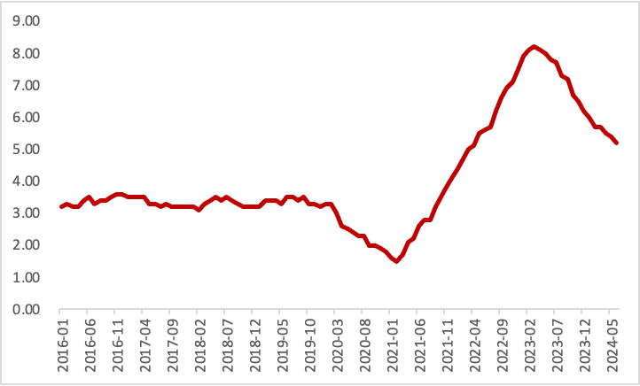 除住房项以外,医疗保健服务价格环比增长0.2%,较前值0.3%继续回落;其中医生服务价格指数环比较前值上升0.1%,而医院服务环比上涨0.1%,较前值0.5%保持下降趋势。交通运输服务价格则环比下降0.5%,较前值持平,其中机动车维护服务(环比增长0.2%,前值0.3%)在本月不升反降,机动车保险(环比增长0.9%,前值-0.1%)则在本月反弹,而机票价格(环比增长-5.0%,前值-3.6%)在本月则持续放缓。总体来看,早前美国核心通胀率之所以居高不下,主要归咎于住房以及保险和医疗保健等核心服务的成本上升。但随着核心服务业整体偏弱,加上上周公布的6月非农就业数据报告显示薪资增速持续减缓,非住房服务业的通胀应随着时间的推移将逐步放缓。
