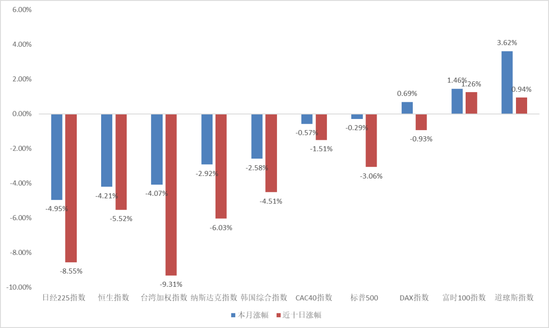 近期海外各国股市均出现了显著的回调。截至7月26日的近十个交易日内,美股三大股指中,道指累计上涨0.94%,标普500下跌3.06%,纳指下跌6.03%;欧洲三大股指中,英国富时100指数上涨1.26%,法国CAC40指数下跌1.51%,德国DAX指数下跌0.93%;亚太市场中,日经225指数下跌8.55%,韩国综合指数下跌4.51%;香港恒生指数和台湾加权指数分别下跌5.52%、9.31%。整体来看,美股此前受降息交易和特朗普交易双重预期影响,频繁创出历史新高,而随着美股二季度财报的披露,市场开始重新审视此前的估值预期,美股随之向下调整;欧股较早触及高点,欧洲三大股指均在5月中旬达到历史高位后回落;亚太股市则跟随美股波动。7月13日特朗普在竞选活动上遇袭后,其支持率相较拜登大幅提高。在随后的共和党全国代表大会上特朗普被正式推选为共和党总统候选人,并确定俄亥俄州联邦参议员万斯为副总统候选人。民主党方面,受一系列因素叠加,现任总统拜登宣布放弃竞选连任,转而支持副总统哈里斯为总统候选人。民主党临阵换帅,加上党内对候选人人选的分歧,更增加了胜选的可能。由于哈里斯尚未提出明确的竞选纲领,因此仅将其过往的政策主张与特朗普进行对比。