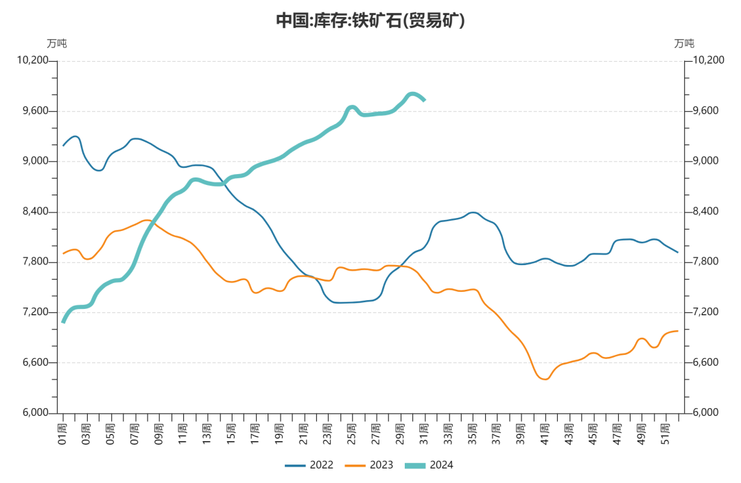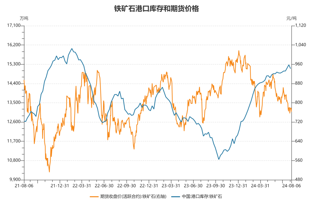 8月5日,中国47港进口铁矿石库存总量15550.43万吨,较上周一下降116万吨;45港库存总量14966.43万吨,较上周一下降112万吨。自5月底以来,铁矿石45港库存围绕1.5亿吨上下同期高位波动,库存较年初同比增加近3000万吨。截至8月2日,港口贸易矿库存为9721万吨,较年初增加2741万吨,库存增量主要来自贸易矿。同期,港口澳矿库存增量1780万吨,巴西矿增量325万吨。库存增加的主要原因之一是钢厂铁水产量的下降,调研数据显示,2024年1月—6月份,全国247家钢企生铁产量为4.15亿吨,同比下降1447万吨;日均铁水产量为228.2万吨,折算铁矿石需求减量为2057万吨。库存增加的另一个原因,非主流矿及巴西矿发运增加。调研数据显示,澳洲铁矿石上半年发运量4.66亿吨,同比减少10万吨,巴西上半年发运量1.78亿吨,同比增加1175万吨,其他国家上半年发运量1.43亿吨,同比增加2314万吨。从铁矿石库存和价格最近3年的走势分析看,两者在大部分时候是正向关系,更多时候存在的情况是,价格和库存的同步上升,背后的逻辑是资金投机需求下的囤货。铁矿作为上游产品,叠加大部分依靠进口的原因,近几年受国际宏观影响比较大,在宏观真空期叠加产业弱现实的情况下,库存尚能成为压制价格的参考依据。当下,产业弱现实主导,宏观面,近有政治局会议利好,远有美联储降息及经济衰退的担忧。从文华商品指数看,资金已经在卖出美联储降息的事实,等待落息的真正落地及金九银十的到来,当下的低点或更低的低点到来,后期往上的空间值得期待。本报告中的信息均来源于公开可获得资料,瑞达期货股份有限公司力求准确可靠,但对这些信息的准确性及完整性不做任何保证,据此投资,责任自负。本报告不构成个人投资建议,客户应考虑本报告中的任何意见或建议是否符合其特定状况。本报告版权仅为我公司所有,未经书面许可,任何机构和个人不得以任何形式翻版、复制和发布。如引用、刊发,需注明出处为瑞达期货股份有限公司研究院,且不得对本报告进行有悖原意的引用、删节和修改。
