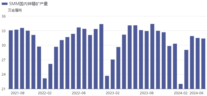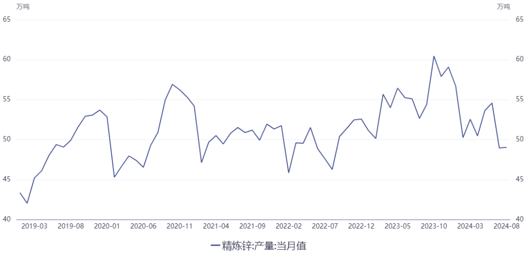 数据:2024年7月SMM中国精炼锌产量为48.96万吨,环比下降5.627万吨,环比下降10.3%,同比下降11.15%,1-7月累计产量367.1万吨,累计同比下降2.81%,低于预期值。其中7月国内锌合金产量为9.22万吨,环比下降0.085万吨。预计8月国内精炼锌产量环比微增0.07万吨至49.03万吨。