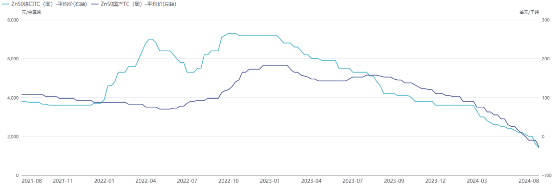 锌精矿进口方面来看,上半年海外受极端天气、罢工、原矿品位下降等问题,锌精矿整体产量偏少,另外因欧洲冶炼厂复产对锌精矿需求量增加,流入国内的锌精矿有限,上半年流入量171.5万实物吨,累计同比下降24.7%,进口量同比下降明显;截至8月2日,进口锌矿TC价格-30美元/干吨。