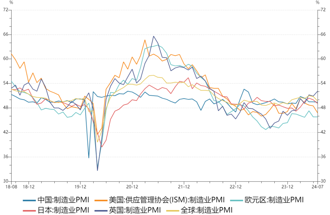 一、全球经济衰退预期升温,外贸支撑减弱。今年以来,全球出现需求从服务转向商品的趋势,以及欧美补库存周期开启,在上半年对全球商品贸易量形成一定支撑。但从最新数据来看,7月全球制造业PMI指数为49.7,较上月下降1.1个百分点,年内首次回落至收缩区间;主要经济体PMI指数在7月多数表现不佳,美国PMI回落1.7个百分点,欧元区持续在收缩区间内运行,日本再度回落至荣枯线下,全球经济复苏动力继续趋弱。近期美国非农回落、失业再创短期新高,叠加日本央行加息强化了市场对于全球经济衰退的预期。若美国经济在接下来降息后表现不佳,则其余经济体制造业料持续受到拖累,并且地缘局势始终僵持不下,我国对外贸易或在一段时间内持续受阻。