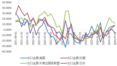 分国家看,7月我国对欧美出口增速显著改善,同比增速分别为8.0%、8.1%,分别比上月改善3.9%、1.5个百分点,或与运费涨价下的抢出口效应相关联;而在新兴经济体中,对东盟、拉美、俄罗斯、非洲等地区出口同比较前值分别回落2.9、2.0、6.3、4.3个百分点,或主要源于美欧等最终需求国经济放缓所带动的动能回落,同时美国大选临近,对我国外贸也将带来一定的不确定性。