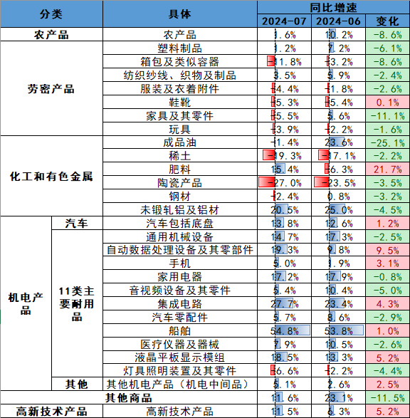 二、气候因素扰动,出口回落不及预期。按美元计价,7月我国出口同比增长7.0%,与预期的9.5%走势截然不同,结束了此前连续四个月的环比上涨趋势,大概率受到台风“格美”的影响。据交通运输部数据显示,7月15-21日(台风前)港口完成集装箱吞吐量为631.3万标准箱,7月22-28日(“格美”来袭)下降为556.8万,而最新数据显示7月29日-8月4日已恢复至610.5万标准箱,这也侧面反映出台风对我国外贸所带来的短期影响。夏季为台风多发期,所带来的影响多为短期扰动。
