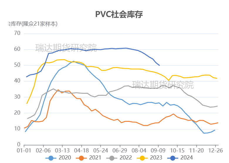 据隆众资讯统计,截至2024年9月12日,PVC社会库存(21家样本)为49.83万吨,环比减少3.51%,同比增加13.70%。社会库存维持去化趋势。