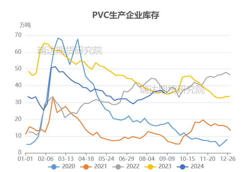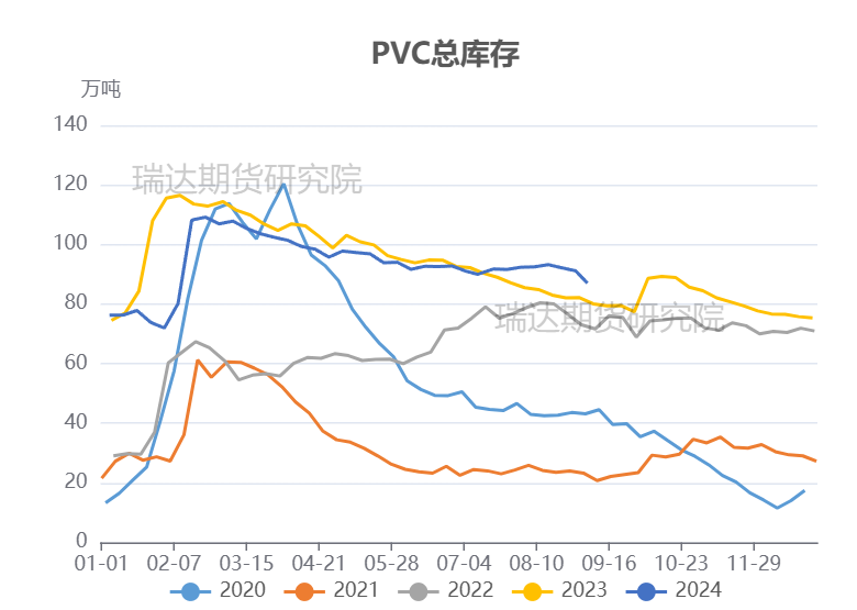 7月下旬至8中下旬,PVC现货价格持续下行,下游生产商逢低补库,社会库存高位去化;然而在此期间,大量PVC装置结束检修并重启,导致供应压力上升、生产企业库存走高,因此总库存呈缓慢上升趋势,从7月18日的31.46万吨增长至8月29日的37.16万吨。