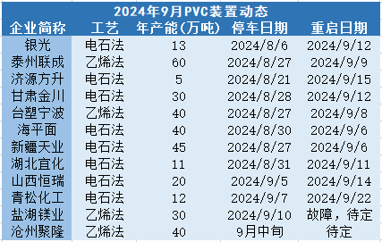 9月装置检修计划较少,除山西恒瑞20万吨停车7天、青松化工12万吨停车15天以外暂无其他停车计划。8月停车的泰州联成60万吨、新疆天业45万吨、台塑宁波40万吨等装置于9月陆续重启,并且大部分产能重启日期分布于9月中上旬。虽然短期内电石法利润收窄、乙烯法小幅亏损可能会导致部分装置负荷下降,但总体上9月供应增量预期没有变。
