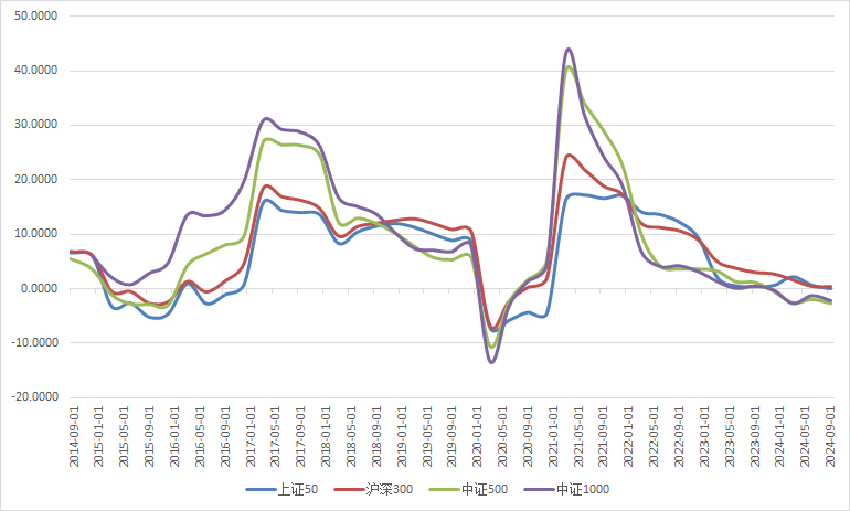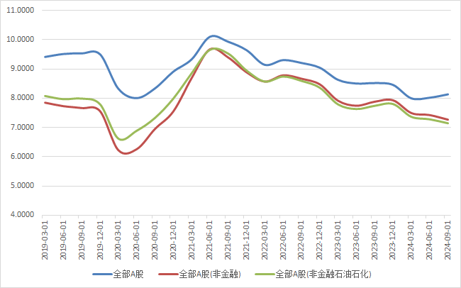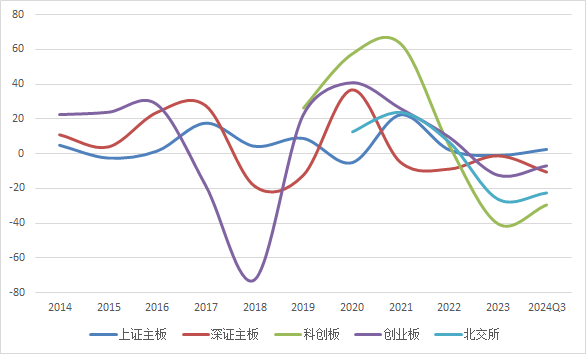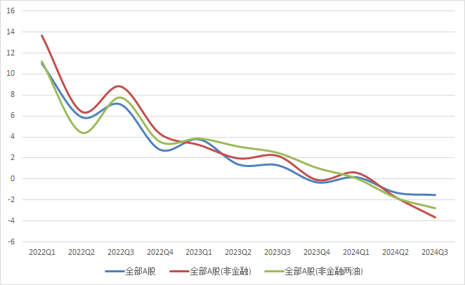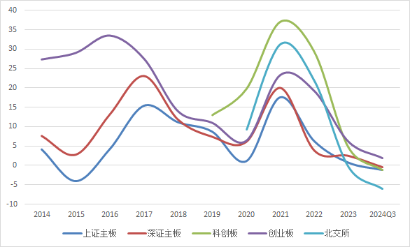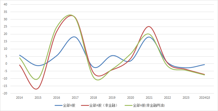 截至10月30日,A股共有5348家上市公司对外披露三季报。截至2024年三季度,营业收入方面,全A、全A非金融以及全A非金融两油同比增长-0.87%/-1.65%/-1.53%,较半年报增速降幅分别为0.36/1.09/0.70个百分点;净利润方面,全A、全A非金融以及全A非金融两油同比增长-0.54%/-7.20%/-7.44%,较半年报回落2.55/1.41/1.01个百分点。单季度来看,全A营业收入、归母净利润同比增长-1.51%、4.77%。周期上看,A股整体业绩仍在低位波动,Q3单季度较Q2继续下滑。金融板块对全A利润拉动贡献较大,形成非金融与全A业绩分化的原因。整体宏观环境上,三季度国内GDP不变价同比增长4.6%,同步处于阶段性低位,价格因素拖累名义GDP增长约0.6个百分点,通胀低迷形成实体经济盈利增长的掣肘,除开内需疲软因素,外部输入性因素不可忽视。随着三季末宏观政策的密集出台,在四季度更多财政增量支撑下,预计支撑三季度形成年内盈利增长低点。截至2024年三季度,营业收入方面,上证主板、深证主板、科创板、创业板及北交所同比增长-1.19%/-0.43%/-1.15%/1.87%/-6.02%;净利润方面,上证主板、深证主板、科创板、创业板及北交所同比增长2.37%/-10.48%/-29.64%/-6.81%/-22.52%。主板净利润增速强于双创和北交所,主板净利润较2024半年报回升2.94个百分点,创业板、科创板和北交所环比分别下降2.95、4.68、3.20个百分点。板主要受金融行业权重较大影响,盈利有所改善。主板盈利增长支撑了全A业绩的修复,科创板与创业板中初创企业占据更高比例,在内外部宏观局势不稳定的情况下盈利能力转弱。自2023年8月监管层表态将收紧IPO、发挥逆周期调节作用后,2024年上半年新股发行数量、融资额锐减,而IPO发行节奏收紧,将使得并购重组成为更多PE、VC重点考虑的重要退出方式之一,再加之科创板八条改革措施等一系列鼓励并购重组的政策措施出台,科创企业有望迎来通过并购重组实现资源整合和优势互补的黄金机遇,或对整体板块未来业绩形成利好支撑。截至2024年三季度,营业收入方面,上证50、沪深300、中证500和中证1000同比增长-0.39%/0.57%/-2.90%/-2.93%;净利润方面,上证50、沪深300、中证500和中证1000同比增长7.36%/4.01%/ -10.09%/-9.60%,大盘指数盈利能力显著回升,上证50与沪深300净利润分别较半年报回升8.38个百分点、6.25个百分点,中证500与中证1000净利润边际下滑,较2024上半年分别下降1.43个百分点、0.53个百分点。从行业板块的视角来看,可选消费归母净利润同比增速最快,达到52.1%;此外,半导体、日常消费零售和非银金融行业增速也较高,均超过40%。近5年前三季度对比来看,可选消费、日常消费、非银金融等行业归母净利润增速创出新高,贡献了大盘股指业绩相对走强的格局。从细分行业表现来看,三季度农林牧渔板块延续较强业绩盈利能力,随着时间步入三四季度,天气转凉对肉类需求有望持续回升,同时供给端偏紧的格局下,农林板块后续业绩仍有空间,而房地产及钢铁板块仍然受制于地产下行周期中内需低迷的影响,整体盈利增速大幅下滑。从1-9月的房地产数据来看,销售端与投资端增长仍然低迷,三季度末资本市场拉升形成的财富效应影响下,销售端高频数据有些许回暖,仍需整体宏观预期改善对信心给予支持。资料来源:wind,瑞达期货研究院要点4:净资产回报率边际回暖,三费支出依然偏弱2024年三季度,全部A股的ROE(TTM)为8.14%,较2024半年报提高0.06个百分点。剔除金融石油石化后,净资产收益率分别为全部A股非金融(7.28%)、全部A股非金融石油石化(7.14%),较2024上半年分别下降0.25个百分点、0.24个百分点。需增长动能不足拖累生产需求延续弱势,企业扩产意愿降低,导致总资产增速进一步放缓,此外通胀低位运行,收入端增长缓慢,亦限制了总资产的增速。而2024年前三季度,A股三项费用占营业收入比重为9.84%,较去年同期增加0.29个百分点,考虑到营收同比增速回落,三项费用支出依然偏弱。展望后续,随着宏观政策密集释放,周期底部有望构筑完成。而中长期来看,A股市场仍将面临诸多机遇与挑战。一方面,随着政策红利的持续释放和市场改革的不断深入,A股市场的国际化、机构化进程将不断加快,为市场带来更多的投资机会。另一方面,全球经济形势的不确定性、地缘政治风险等因素也可能对市场造成一定的冲击。因此,投资者需要保持理性的投资心态,合理配置资产,以应对市场的变化。本报告中的信息均来源于公开可获得资料,瑞达期货股份有限公司力求准确可靠,但对这些信息的准确性及完整性不做任何保证,据此投资,责任自负。本报告不构成个人投资建议,客户应考虑本报告中的任何意见或建议是否符合其特定状况。本报告版权仅为我公司所有,未经书面许可,任何机构和个人不得以任何形式翻版、复制和发布。如引用、刊发,需注明出处为瑞达期货股份有限公司研究院,且不得对本报告进行有悖原意的引用、删节和修改。
